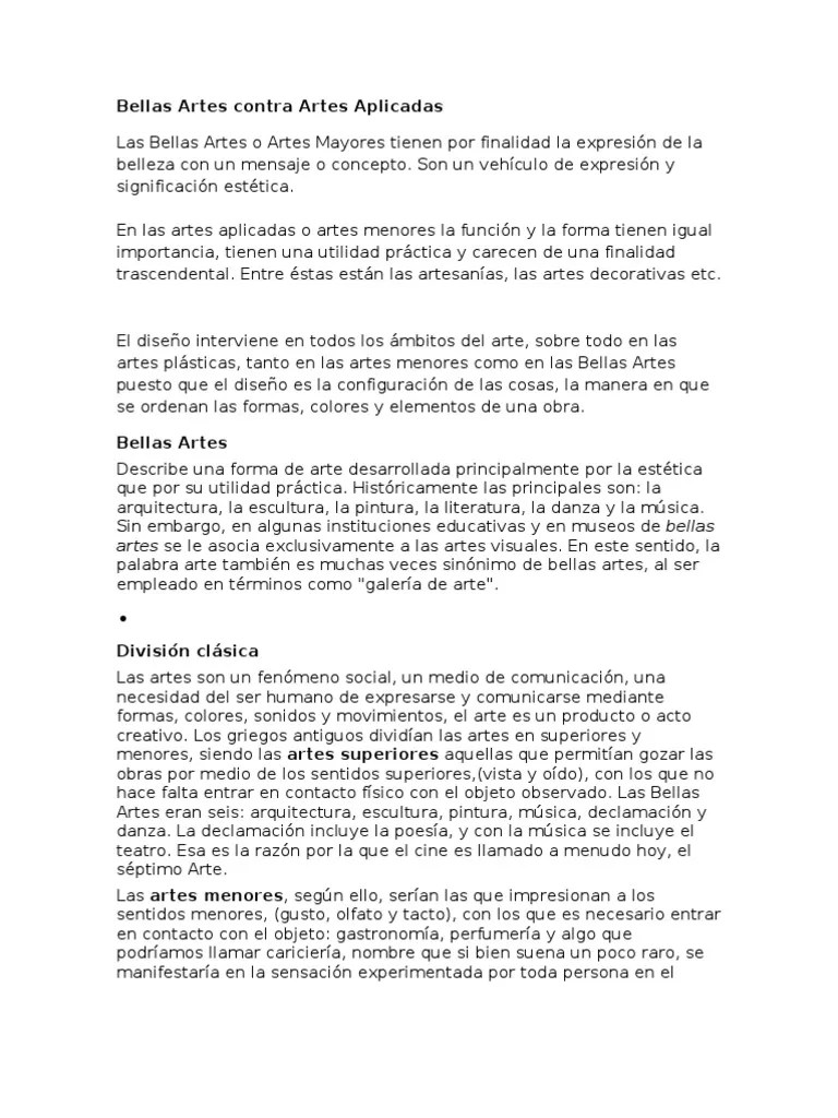 Esta denominación indicaría que todo tipo de manifestación artística distinta de la pintura, escultura y arquitectura serían artes menores. El concepto de artes mayores se utiliza en oposición al de artes menores o aplicadas, para considerar a éstas como artesanías y a aquellas como artes liberales, a las primeras como forma de expresión de la belleza y a las segundas como forma de ejecución de objetos en los que prima la utilidad, todo ello en el contexto de la valoración del trabajo intelectual y minusvaloración del.. 09.06.2015 · lógicamente unas artes se consideran menores en referencia a las mayores, es decir, la pintura, la escultura y la arquitectura.